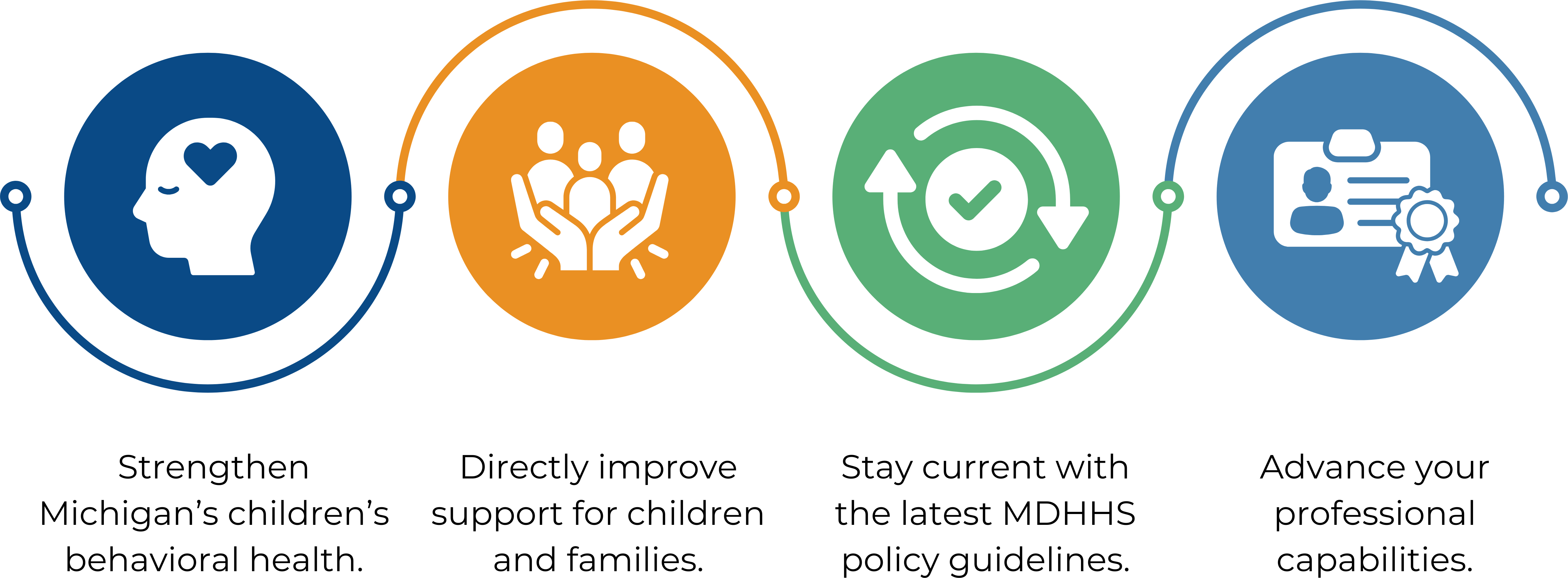 The Michigan Capacity Building Center is committed to enhancing behavioral health services through strategic professional development. The strength of the behavioral health system lies in the continuous growth and support of its professionals. Training programs are designed to bridge knowledge gaps, introduce innovative practices, and provide the tools and resources necessary for professionals to excel in supporting Michigan's children, youth and families.
